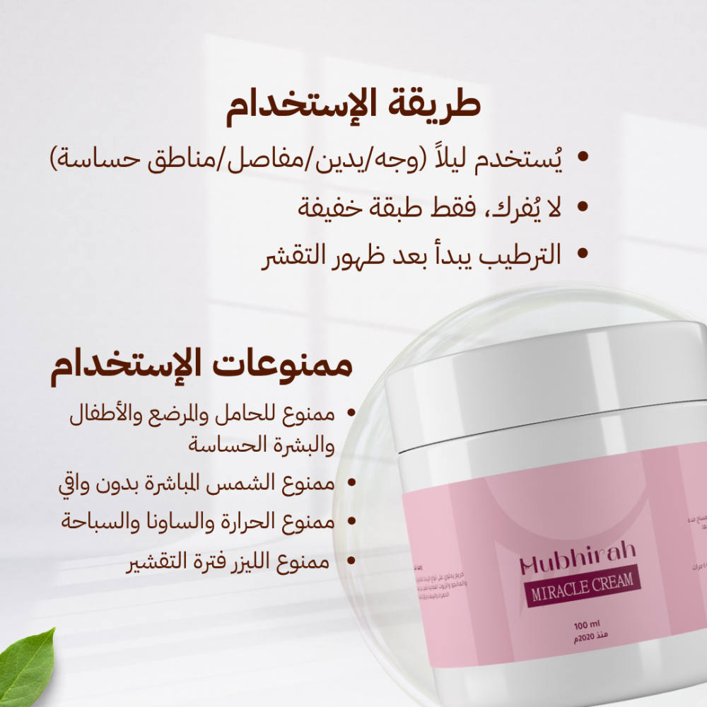 قبل النوم -> غسل الوجه بغسول مناسب ثم نضع طبقه خفيفة من مقشر المعجزة على الوجه دون فرك، وتجنبي وصول المقشر إلى محيط العينين.